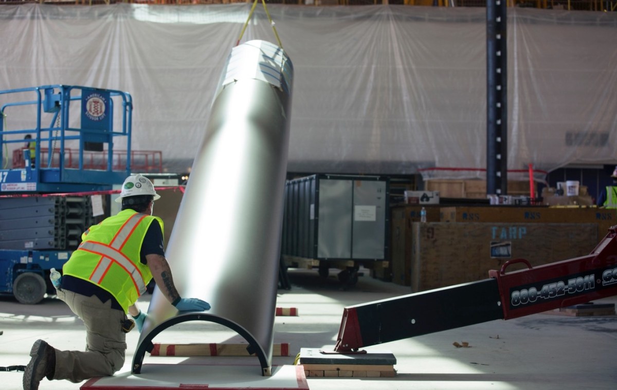 Un operario vigila cómo levantan la recubierta de unas de las columnas que soportan el techo de la «spaceship».