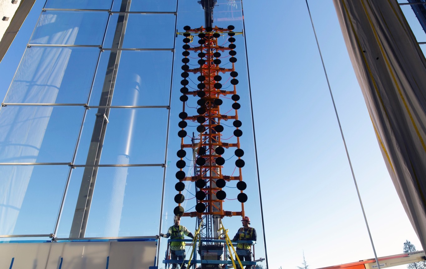 Sí, todo eso son ventosas. Aquí podemos ver cómo se coloca uno de los cristales de la zona del atrio de la «spaceship».