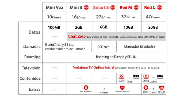 La contrapartida de esta actualización se encuentra en el coste, que crecerá hasta cinco euros para todos los clientes. En las siguientes tablas puedes ver los servicios incluidos y el nuevo precio de las tarifas móviles de Vodafone: