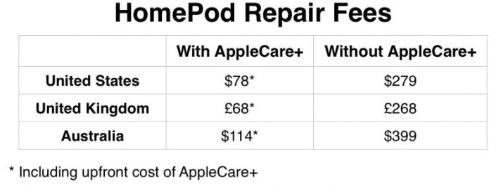Los propietarios de un HomePod y que no compren AppleCare+ deberán apagar 279 dólares en Estados Unidos, 269 libras en el Reino Unido o 399 dólares australianos en Australia para reemplazar o reparar el altavoz por cualquier daño, a menos que no sea un problema de defecto de fabricación —cubierto por la garantía limitada de Apple—.