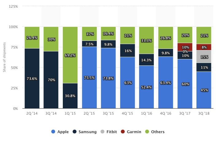 El gráfico superior proviene de Statista y cuenta con datos hasta el tercer trimestre del año pasado (aún faltan unas semanas para conocer los del último del año). La cuota de mercado no sirve de mucho si ignoramos el rango de precios o el beneficio que se genera por cada jugador. Pero en este caso nos muestra cómo el Apple Watch, a pesar de ser gama premium, se encuentra varias veces por delante de compañías como Samsung o Fitbit.