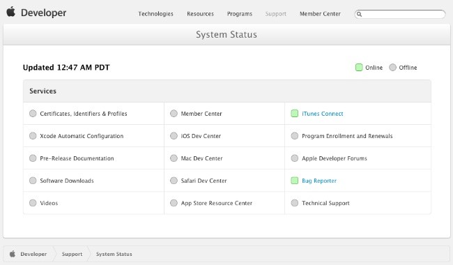 Más información | Web del estado de los servidores de desarrollo de Apple