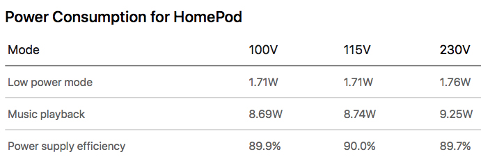 Apple dice que el HomePod consume menos energía que una bombilla de luz LED doméstica con certificación ENERGY STAR durante la reproducción de música. La comparación es cierta, ya que una bombilla LED de la serie A con forma clásica normalmente consume entre 9 y 10 vatios, mientras que el HomePod consume alrededor de 8,74 W con 115 V de voltaje durante la reproducción de música al 50 por ciento del volumen. Por supuesto, la potencia variará según el volumen.
